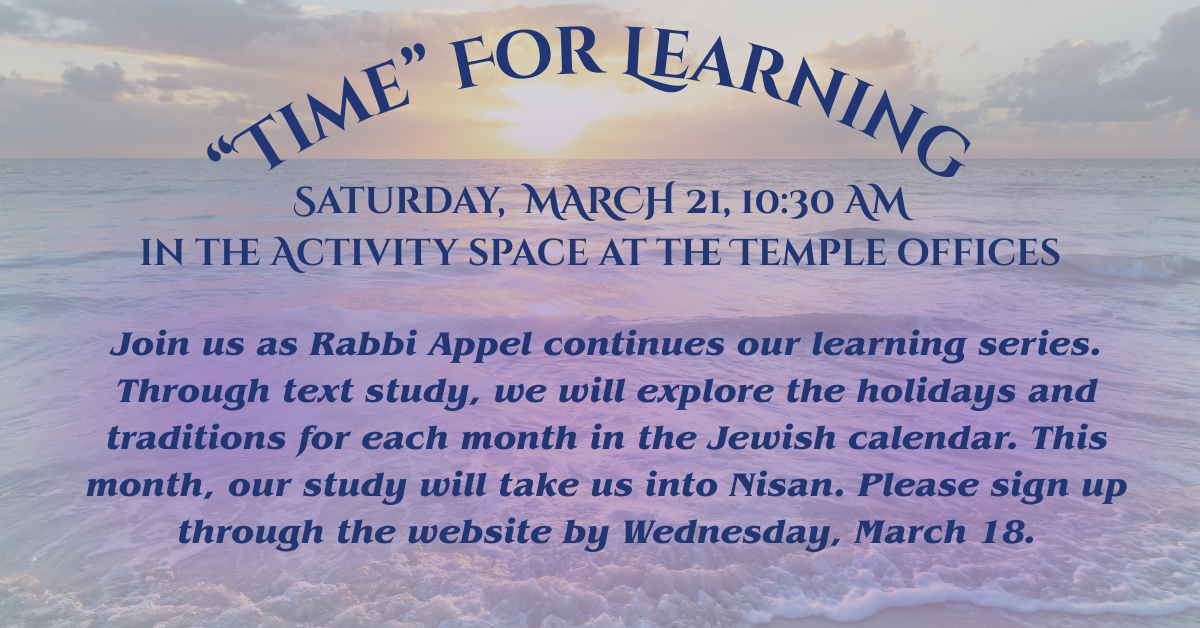 Join us as Rabbi Appel leads our new learning series. Through text study, we will explore the holidays for each month in the Jewish calendar.