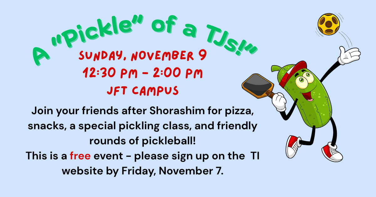 Join your friends after Shorashim for pizza, snacks, a special pickling class, and friendly rounds of pickleball!